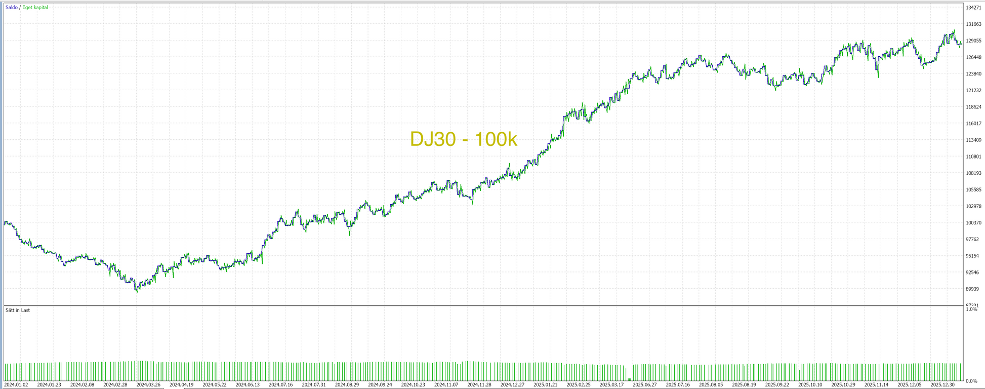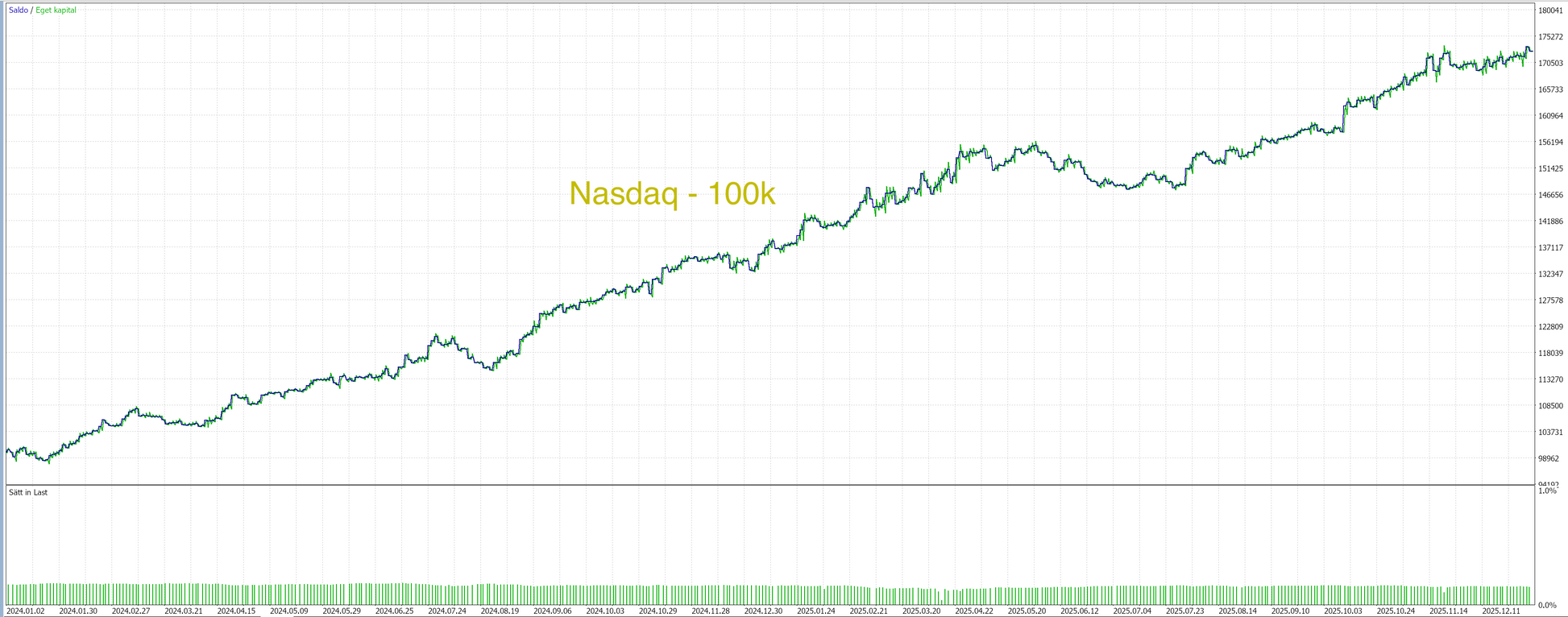Utöver det har vi byggt in en tydlig riskspĂ€rr per trade, dĂ€r du sjĂ€lv vĂ€ljer hur stor del av kapitalet du maximalt vill riskera â exempelvis 2% per trade. Om volatiliteten Ă€r hög och stop loss behöver ligga lĂ€ngre bort, skalar algoritmen automatiskt ner positionens storlek (kontrakt/lotstorlek) sĂ„ att den inte överskrider din angivna maxrisk.